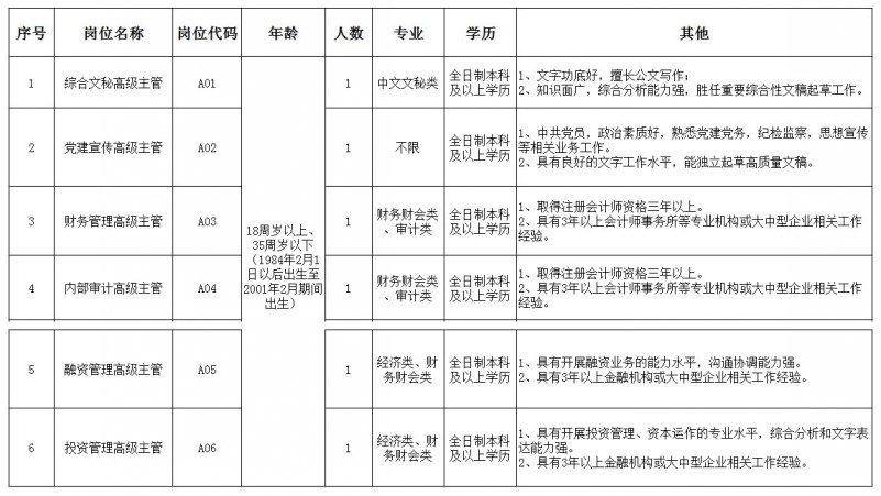 根据工作需要,面向社会公开招聘综合文秘、高级主管等岗位工作人员共计6名。现将相关事项公告如下: