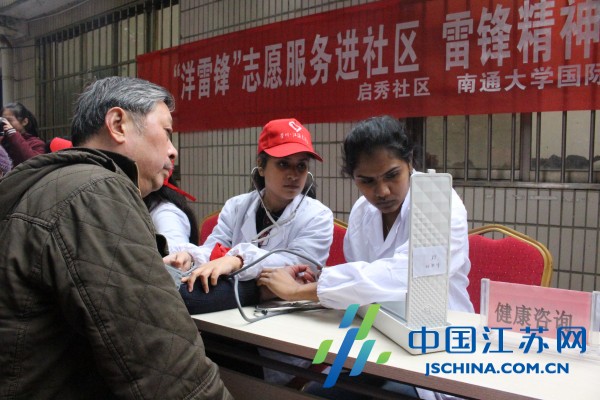 中国江苏网3月5日南通讯(通讯员 付廷锋)日前,南通市新城桥街道启秀社区联合南通大学国际教育学院开展“志愿服务进社区,雷锋精神永传承”志愿服务活动,南通大学“洋雷锋”志愿者走进华能苑小区为邻里居民义诊,并介绍健康饮食知识,得到居民一致好评。