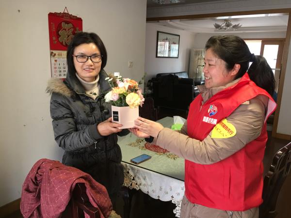 3月7日上午,文峰社区劳模志愿服务站的工作人员带着鲜花和家居保洁人员来到社区市级劳模曹美英家中,为她送“三八节”节日祝福。