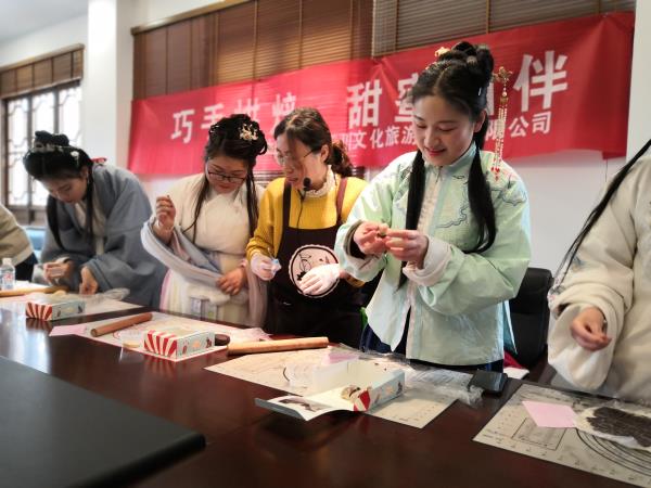 活动中,女同胞们在专业烘焙老师的指导下,一步步探索驴打滚的制作过程——手擀糯米团、碾压红豆沙、铺撒黄豆粉、卷裹切块,活动现场弥漫着浓郁的香甜味。其中最亮眼的是来自记茗蹊文化传播工作室的四位美女,她们身着大袖翩翩、交领、右衽的汉服,用展示中国古代女性盛妆打扮的姿容,来迎接“三八”国际劳动妇女节。