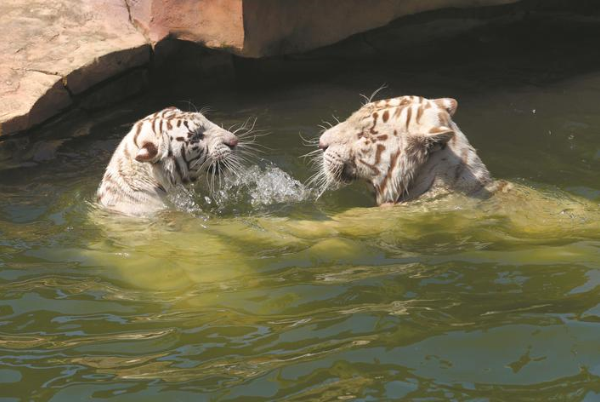 在连续的高温天气里,居住在南通森林野生动物园里的动物们,是如何度过这个炎炎夏日呢?昨天,记者看到,龙凤胎大熊猫星繁在冰块旁享用玫瑰苹果冰,白虎泡在水池中戏水……据了解,南通森林野生动物园的防暑降温措施多样化,通过人工举措,模拟动物原始栖息环境,还原动物生存习性,让动物轻松过夏天。