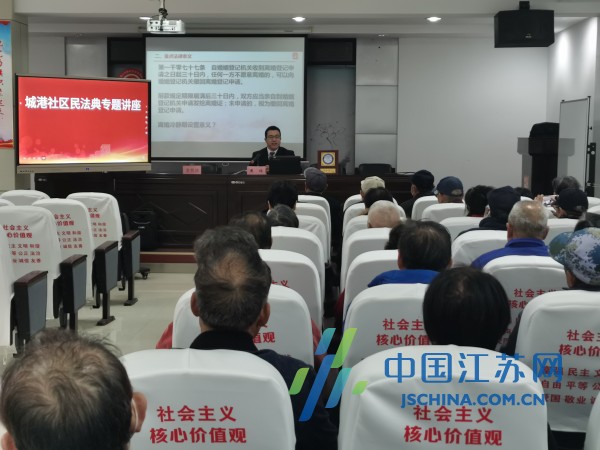 中国江苏网11月24日南通讯 为进一步普及宣传《民法典》法律知识,增强群众的法律意识和维权意识,11月24日,南通市崇川区任港街道城港社区开展《民法典》婚姻家庭法治宣传讲座,邀请来自南通港法庭的焦楠、贵贺湧法官授课,辖区70余名党员群众参加。