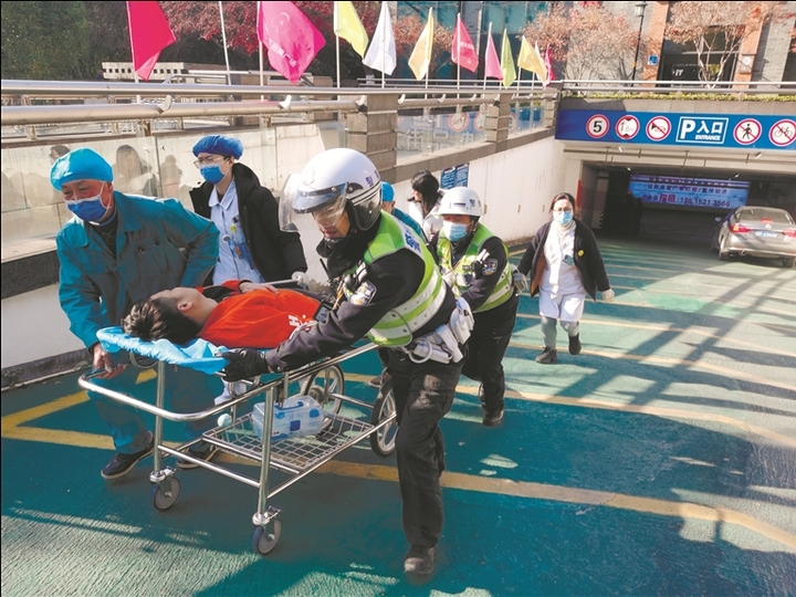 民警奔至现场后发现,一名年轻男子躺在地面,身旁一名女子不停呼救。因地下手机信号不佳,民警一时联系不上医院急救,于是立即奔跑至附近的中医院急诊,联系了担架和医务人员。短短5分钟,急诊医生带着担架赶到现场,一群人立即将昏迷男子送往医院急救,上演了一场生命护卫战。