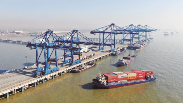 昨日在通海港区拍摄的集装箱堆场和繁忙的集装箱码头。据南通市交通运输局发布的信息,2020年,南通港集装箱保持快速增长态势,累计完成集装箱吞吐量191.1万标箱,同比增长24%,创下历史新高。 记者 许丛军摄