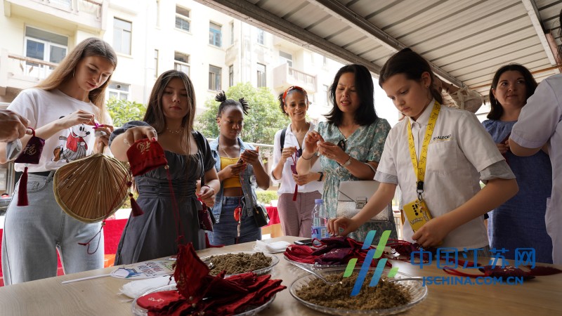 当天下午,留学生们走进社区渔民小院,与通燧社区、泽生社区的网格长、网格员以及渔民代表们欢聚一堂。首先登场的是一个个异香扑鼻、精巧别致的香囊,来自南通汉药中医医院的中药师介绍到:“佩香囊是端午节的传统习俗,香囊内装有丁香、艾叶、川芎等中药材,佩戴香囊可以起到清香、驱虫、避瘟、防病的作用。”看着一边毫不起眼的中药原料,国际友人们个个面露惊诧,“没想到中药制成的香囊有这么神奇的功效!”来自俄罗斯的玛雅一边说着,一边学着现场“崇川e起行”志愿者的动作,给自己制作了一个精致的香囊。