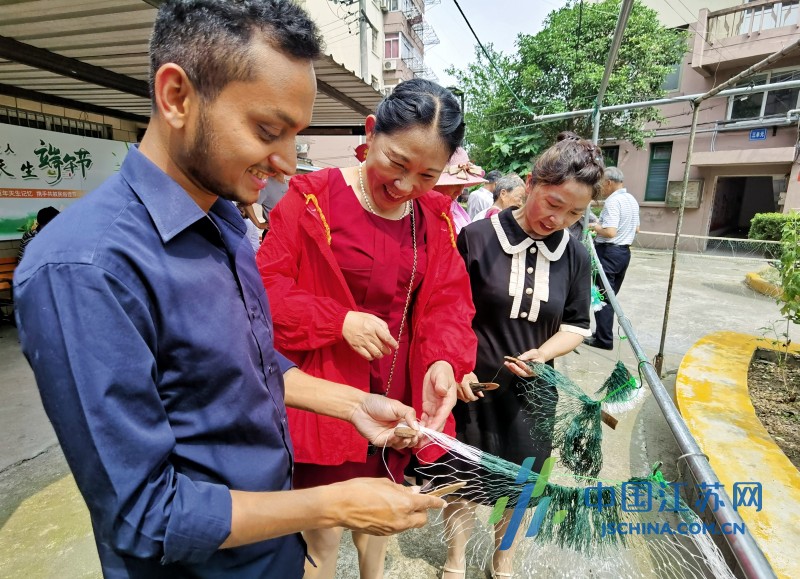 戴起中药香囊的国际友人们兴致勃勃的观摩社区上岸渔民编织渔网,老渔民党员张祖发手中不停,嘴上介绍着:“我们以前就是靠着这个手艺,靠江吃江。现在,国家高度重视生态环境保护,开展长江大保护行动,十年禁捕。我们这些渔民上岸了,也在政府的帮助下过上了幸福生活。不过,我们不能忘本,保护母亲河,我们也要出力。”在渔民沈小英娴熟的操作下,不一会儿,一张渔网“神奇”地展现在众人面前,国际友人们也忍不住纷纷动手体验。