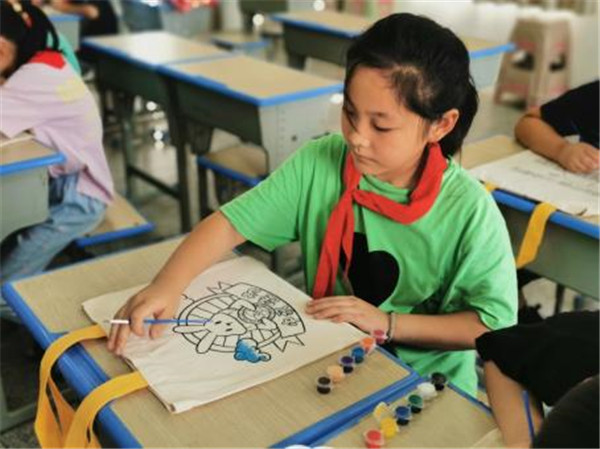 活动现场,社区工作人员将环保袋制作材料分发给每一位学生,并介绍每个工具的作用、相关注意事项、颜色的搭配及填色技巧。大家听完讲解后,就开始耐心勾画底稿,用心挑选自己喜欢的色彩,托腮思考构想,一个个空白的环保布袋,在大家的妙笔下,瞬间变得“萌萌哒”。