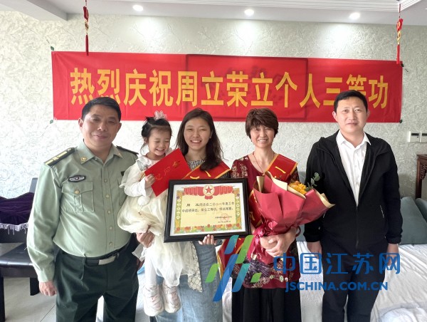 中国江苏网5月23日南通讯 为继承和发扬拥军优属优良传统,营造“一人参军、全家光荣”的良好氛围。5月20日,南通市崇川区退役军人事务局与狼山镇街道人武部相关负责人到三角桥社区星光耀小区,为现役军人周立家属送去“三等功”立功喜报,同时也送上党和政府的关怀与祝福。街道、社区退役军人服务站相关工作人员参加了活动。