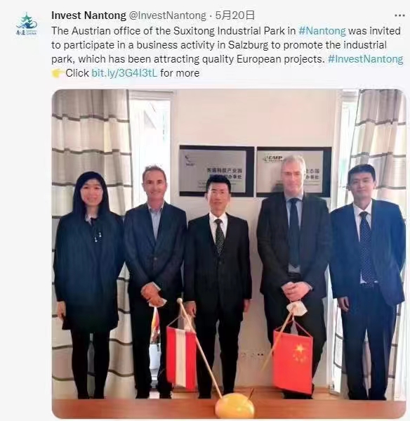 中国江苏网5月23日南通讯 奥地利时间5月19日上午,中国驻奥地利经商参处孟繁壮参赞团队及奥地利联邦数字化和经济区位部亚太处迈尔干事到访苏锡通科技产业园区驻奥地利维也纳办事处,并与该园区投促局进行视频连线,就中奥苏通生态园本年度发展情况进行了交流。