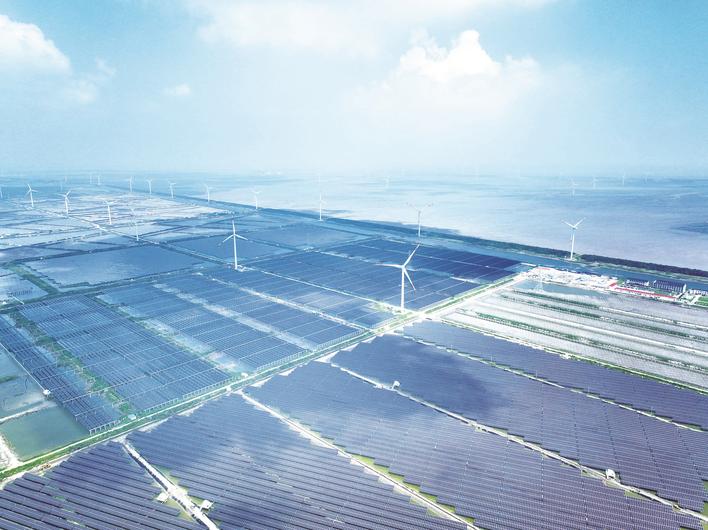 10日在如东县拍摄的“渔光互补”光伏发电项目。据...