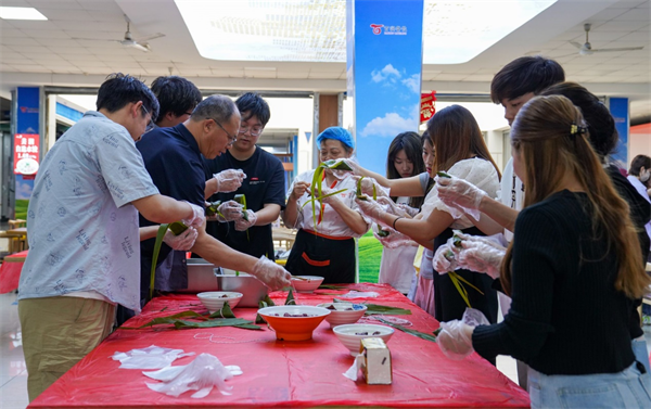活动期间,学校组织老挝留学生、少数民族学生代表等包粽子,感受端午节的文化乐趣。活动现场,学校领导、辅导员老师还有食堂的工作人员围在一起,一边关心同学们的学习生活情况,一边和同学们一起将粽叶做漏斗状,填糯米、压紧实、封口、扎捆,做成了鲜绿飘香的粽子。老挝学生第一次接触粽子,对这种中华传统美食充满了好奇,他们仔细观察着包粽子的步骤,并积极尝试,体验着中国传统文化的魅力。少数民族学生则分享了自己家乡的端午习俗,让大家感受到了中华传统文化的丰富多彩。校党委副书记邓海龙在总结此次活动时指出,端午节作为传统节日,承载着丰富的文化内涵。包粽子不仅是节日活动,更是中华优秀传统文化的传承。