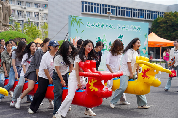 工院学子带来了舞龙表演,现场的同学们在观赏舞龙舞狮的同时,领略传统文化的深邃内涵与无穷魅力,增强了文化自豪感;校领导和关工委的老教师为学生发放粽子,让每一位学生感受到学校对他们的关心爱护,感受到学校的人文关怀;两校区开展的旱地龙舟赛激发了同学们同舟共济的团结协作精神,张忠对各学院的龙舟队进行赛前鼓舞,紧接着,领导共同为龙舟点睛,4条首发旱地龙舟如离弦之箭,奔向百米外的终点。现场的同学们热情观赛,欢呼声和加油声不绝于耳。