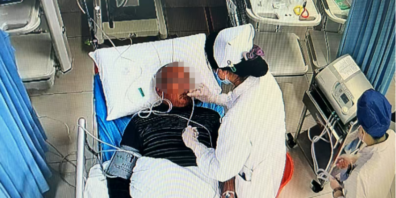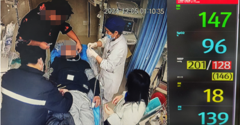 急诊中心护师金湘怡迅速推来抢救床,将被两人扶着的患者老姚(化名)转移至抢救室内,经过初步生命体征监测,发现其病情十分危重:心电监护提示Hr 147次/分,BP 201/128mmhg,RR 18次/分,SPO2 96%,这些数据都表明,老姚生命体征极不稳定,需要立即进行抢救。