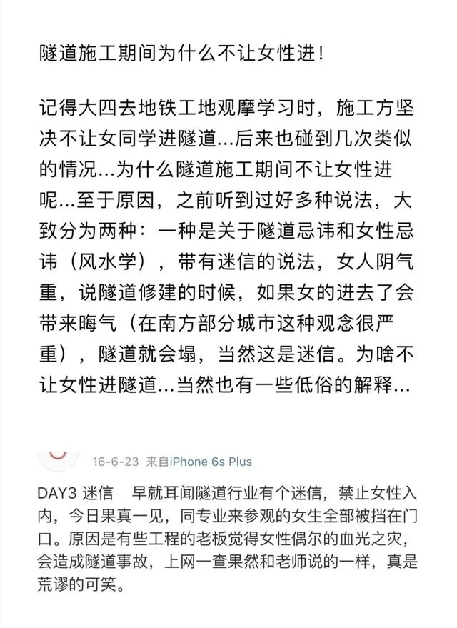 隧道施工期间不让女性进的原因,网上流行这样几种说法:比如根据所谓风水学,害怕女性阴气重,惊扰了“山神”,给隧道施工带来晦气;因为生理期原因,女性和血污被联系在一起,隧道施工方认为女性进去后,会带来不祥。这些大抵都是缺乏事实根据,却脑洞大开、极具“想象力”的封建迷信。