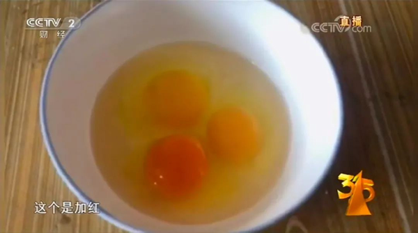 专家介绍,为了迎合消费者的需求,部分养殖者在饲料中添加着色剂以增加鸡蛋蛋黄的颜色,2019年“315”晚会曝光了“化妆”鸡蛋就是养殖户在饲料中添加了着色剂,使蛋黄颜色更深,以此冒充“土鸡蛋”。