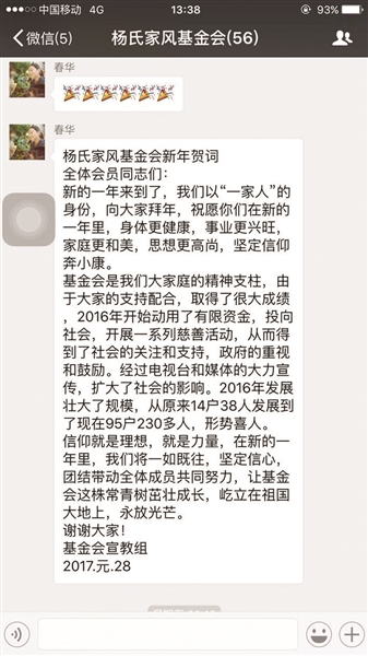杨振海告诉记者:“刚开始的时候,这个群里的人比较少,就我的五个儿子,然后加上孙子辈的家庭,后来家庭成员们都知道了,就发展到三房兄弟,微信群就壮大了,基金会也初具规模,现在还有专人负责,长孙杨勇是基金会会长,学财务的孙女杨娟负责管财务,当小学教师的孙女负责群里的日常慈善宣传。”