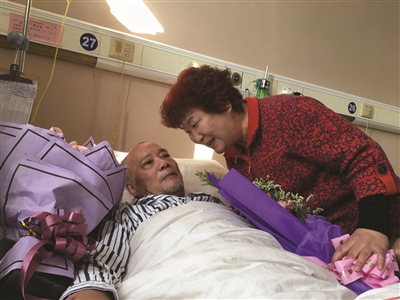 赵静丽给老伴献花,病房过“特别”情人节。陈咏 摄