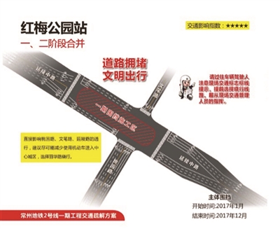 红梅公园站围挡时间为2017年2月19日—2019年12月。红梅公园站位于延陵中路桃园路路口,施工难度最大,将分三阶段进行施工。2017年2月19日~2017年9月,延陵中路、桃园路将利用7个月时间进行盖板施工,在此期间,路口交通组织采取椭圆形转盘和信号灯控制的方式。南北向桃园路和文笔路左转和直行车辆在路口右转后在围挡两端掉头。施工期间将影响延陵中路、桃园路、文笔路、武青路等多条道路,影响天宁禅寺、红梅公园、儿童医院等重要地点的交通出行,请驾驶员合理选择出行路线和时间。第二阶段(2017年9月~2018年5月)和第三阶段(2018年6月~2019年12月31日)将占用延陵中路中间部分道路,在两旁设置疏解道路,车辆和行人由疏解道路通行。桃园路、文笔路路口恢复南北通行。公交11、23、53、62、78路调整,延陵路“江苏银行”双向站撤销。