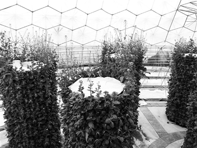 一个酷似鸟巢的展示基地,成为黄博士项目的气培集中展示地。利用八角立柱生长的矮脚黄,一层一层要蹿到天上去,一旁的日本香芹和意大利生菜在斜板上茂盛生长。黄博士说,“一般像这样的香芹个把礼拜就可以冒尖。而且生长空间从平面到立体,设备的占地面积非常小,完全可以用在都市阳台上。”据介绍,气培农业系统可以种植紫背天葵、紫玉青菜、紫色菠菜、紫玉油麦菜、紫衣芥菜,甚至是紫色包菜等。