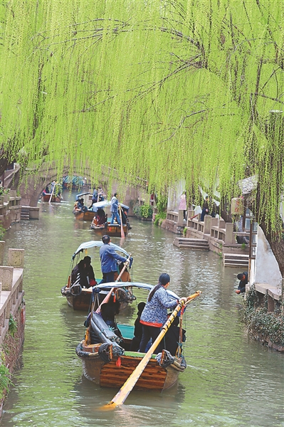 昨日,苏州周庄古镇桃红柳绿,游客前来踏春赏景。 海 昕摄 视觉江苏网供图