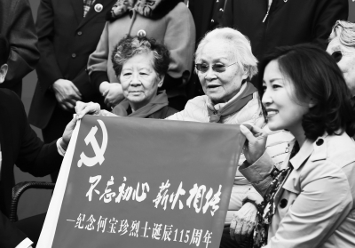 本报讯(通讯员张洪记者李子俊马道军)昨天,刘少奇与何宝珍烈士之女,91岁高龄的刘爱琴来宁,参加“纪念何宝珍诞辰115周年书法展暨座谈会”,深情回忆母亲。周恩来侄女周秉德、任弼时之女任远芳也参加了纪念活动。