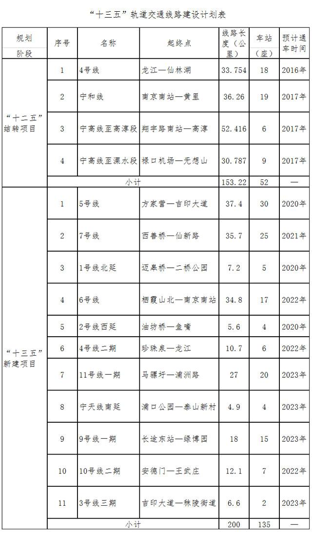 “十三五”期间,计划建设轨道交通项目15个,线路长度约353公里。其中“十二五”结转项目4个,线路总长153公里,车站52座;“十三五”开工建设项目11个,线路总长约200公里,车站135座。“十三五”末,力争轨道交通线网运营总规模达428公里左右,车站总数达212座左右。记者注意到,除了已经运营的4号线一期,这份规划还披露了14条地铁线的开通时间。