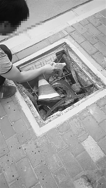 在远泰路上的东山小学分校马路正对面的人行道上,记者发现两个紧邻的窨井盖都出现了损毁严重的情况。据观察,这些窨井盖上写了一个“雨”字,应该是雨水井的盖子。窨井里却没有水,倒是如投诉人所说的那样堆满了各种垃圾,甚至还有一个破损的警示标志牌掉在了窨井里。除此以外,现场附近并没有任何其他警示标志。马路对面就是一所小学,且井盖所处的位置属于学生、家长走路的人行道,现场确实存在较大的安全隐患。
