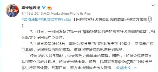 “经与发帖人联系确认,该犬即为之前逃走的藏獒。随后,110指令巡特警支队民警立即赶往现场,将该犬当场击毙。”16日晚间,连云港警方发布消息称,民警联系动物防疫部门对该犬尸体进行妥善处置。
