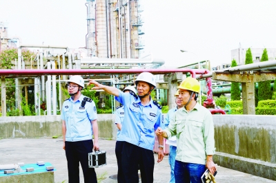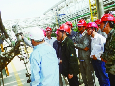 8月4日,栖霞区安监局领导带领执法大队人员检查南京金桐石化夏季安全生产工作。