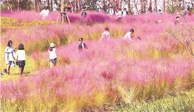 深秋时节,江苏大地鲜花盛开,美若春朝。 图为22日,南京市民来到江心洲西岸江堤上,观赏成片的粉黛乱子草梦幻般的粉红色花穗。 杨娟 乐涛摄 视觉江苏网供图