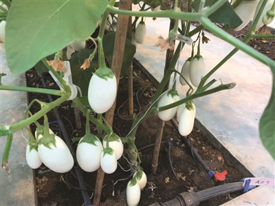 另一种纯白色的茄子也引得不少市民纷纷驻足拍照。紫色的茄子常见,白色的茄子似乎很少见。原来,这种茄子名叫“白蛋茄”,专家介绍,白蛋茄的名字和它的外形有关,因为果皮白色有光泽,形似鸡蛋,所以由此得名。白蛋茄果实品质好,含干物质多,营养价值高,单果质量约100—150克。老熟后的白蛋茄会“变色”,呈现金黄色,那时候它会换个名为“金银茄”的“马甲”,成为一种观赏盆景。