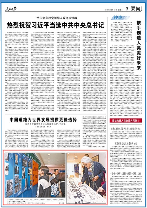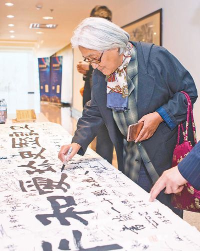 一位参观者在写有“牢记历史 珍爱和平”字样的书法条幅上签名。