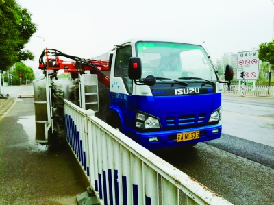雨花台区凤信路上,“右撇子”护栏清洗车清洗护栏。本报记者 马金摄