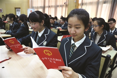 12月4日,2017年国家宪法日公开课暨南京市校园法治教育宣传周启动仪式在南师附中举行,生动有趣的普法公开课上,孩子们热烈互动、发表见解。新华报业视觉中心记者 刘莉 摄