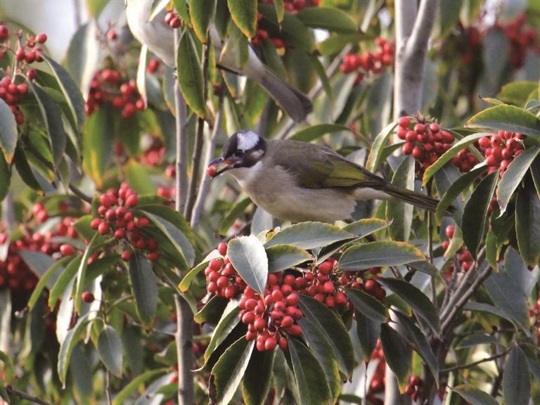 南京的冬青树四季常青,已成为城市主要的绿化树种之一。而冬天冬青树的红果,已成为吸引鸟类进入南京的“美食”。在龙蟠路旁花园中,南京爱鸟人士注意到,这些采食冬青果的鸟儿大多是白头翁,也有乌鸫和椋鸟。另外,还有少量的太平鸟。