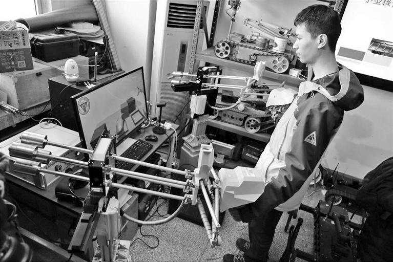 在宋爱国的实验室里,有一个大型的机械臂,可以操纵远端机器人行动。而机器人遇到的阻力等各种与环境相互作用的力觉信息,又会及时反馈回来,使操作者能有效控制机器人完成复杂的任务。宋爱国说,这种人机交互,实际就是将人工智能引入机器人中,或者说把机器人变成人的代理或傀儡。