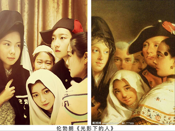 南京林业大学家居与工业设计学院学生的世界名画模仿秀摆拍照片(右为相关名画)。