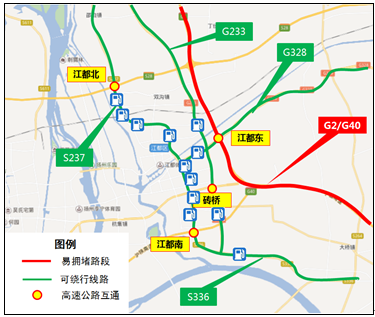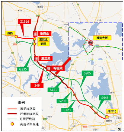 S49新扬高速宿迁-扬州段、G25长深高速淮安-南京段、G2京沪高速淮安-扬州段、G2京沪/G40沪陕高速扬州-广陵段(见图1)。节日期间,以上路段流量大,部分服务区较为拥堵,请大家做好绕行准备!