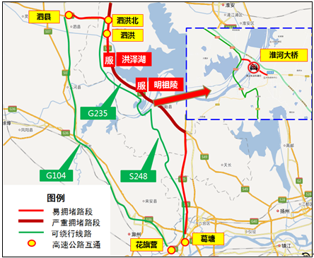 沿线洪泽湖、明祖陵2个服务区拥堵较为严重(见图5),公众可选择G104、G235、S248等进行长距离或短距离绕行!有条件的可到地方道路加油!