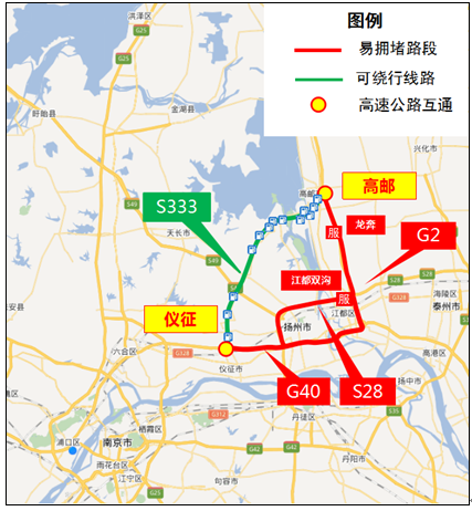 G2京沪高速高邮段、 S28启扬高速、G40沪陕高速扬州绕城段较为拥堵,公众可从S333进行绕行!有条件的到地方道路加油!(见图13)