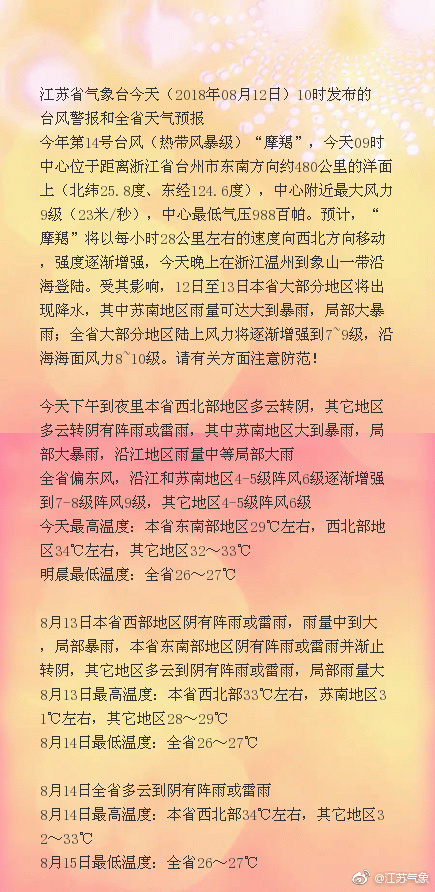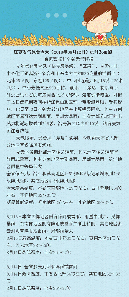 江苏省气象台2018年8月12日09时47分发布台风蓝色预警信号。预计未来24小时内南通,苏州、无锡、常州、镇江、南京、扬州南部、泰州南部和盐城地区将受14号台风“摩羯”影响,陆地风力可达6-7级阵风8-9级,江河湖面风力可达7-8级阵风9-10级,南通和盐城海区风力可达8-9级阵风10级,连云港海区风力可达7-8级,淮河以南大部分地区有中到大雨,局部暴雨到大暴雨,并伴有短时强降水、雷雨大风等强对流天气。请注意防范。
