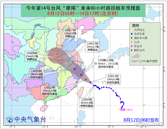 今年第14号台风“摩羯”(热带风暴级)的中心,今天(12日)上午8点钟位于浙江省台州市东南方向大约495公里的东海南部海面上(北纬25.7度、东经124.7度),中心附近最大风力有9级(23米/秒),中心最低气压为988百帕,七级风圈半径150~250公里。预计,“摩羯”将以每小时30公里左右的速度向西北方向移动,强度逐渐加强,12日晚上在浙江温州到象山一带沿海登陆(强热带风暴级,10~11级,25~30米/秒),登陆后将继续向西北方向移动,强度逐渐减弱。