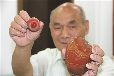 张志多今年73岁,11岁那年,学校组织到梅园新村参观时,他见到了周总理从雨花台拣回来的一碗雨花石,心灵受到震颤的他,从此迷上了雨花石。小时候,他经常和同学相约去雨花台拣雨花石。1963年参加工作后,他的工资几乎全都用来买书、买石头。只要有空闲,他就蹬着自行车到砂矿去找雨花石,或者从卖雨花石的摊贩那里高价收购,至今收藏雨花石有50多年历史,共收藏雨花石上万枚。