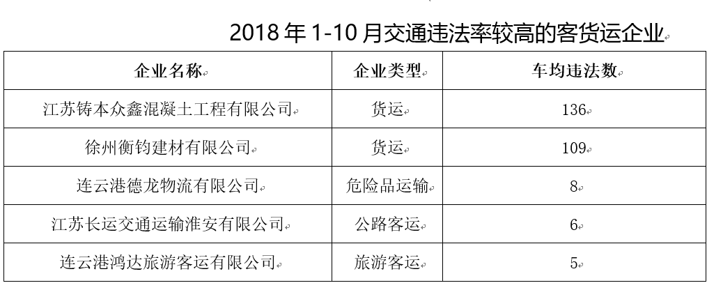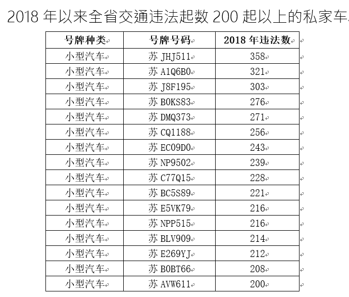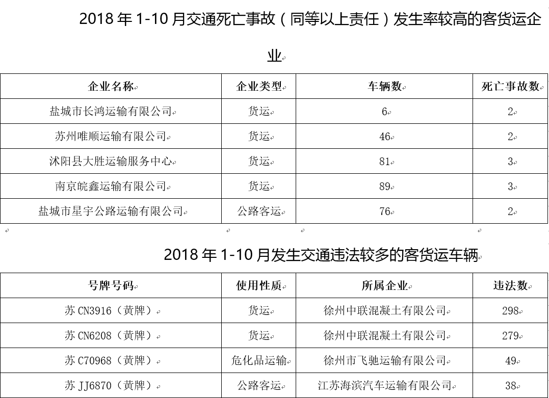 中国江苏网讯 近日,江苏省公安厅交警总队梳理出一批今年以来违法高发的私家车及所属运输车辆违法率、事故率较高的运输企业,予以公开集中曝光。今年以来,全省交通违法起数达100起以上的私家车共有121辆,其中违法起数最高的达358起,一年还没过完,平均一天一起都不止。运输企业中,江苏铸本众鑫混凝土工程有限公司和徐州中联混凝土有限公司所属车辆违法高发,盐城市长鸿运输有限公司虽然只有6辆专业运输车辆,但今年以来已发生死亡事故2起,死亡事故发生率较高。