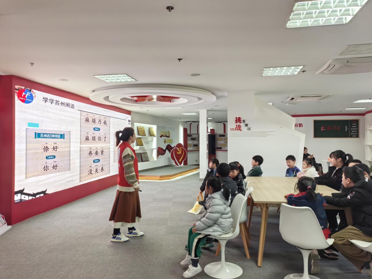 活动伊始,青年志愿者通过提问互动的形式介绍了苏州历史和“苏州闲话”的特点。随后小朋友们跟着志愿者,从简单的问候语开始学起,“倷好”“再会”“饭阿吃过哉”有模有样地模仿着发音。刚开始,小朋友们发音还略显生硬,但在志愿者的耐心纠正与反复示范下,渐渐也能字正腔圆地说出几句。青年志愿者还带着小朋友一起学唱了苏州童谣《外婆家》,轻快的节奏、押韵的歌词,小朋友们瞬间被吸引,通过领唱、跟唱等多种形式,引导小朋友们逐步掌握这首童谣的旋律和歌词,体会童谣里浓浓的亲情。