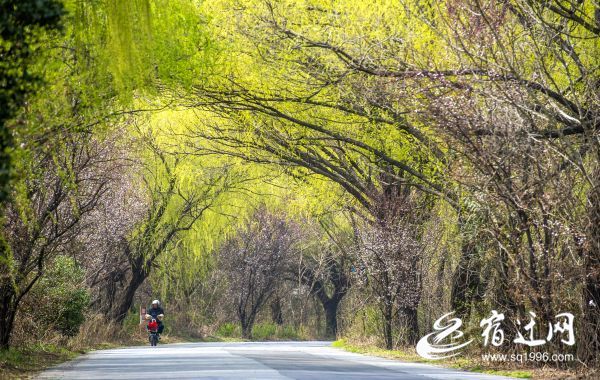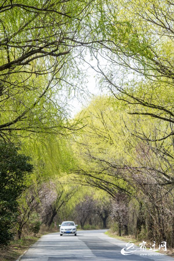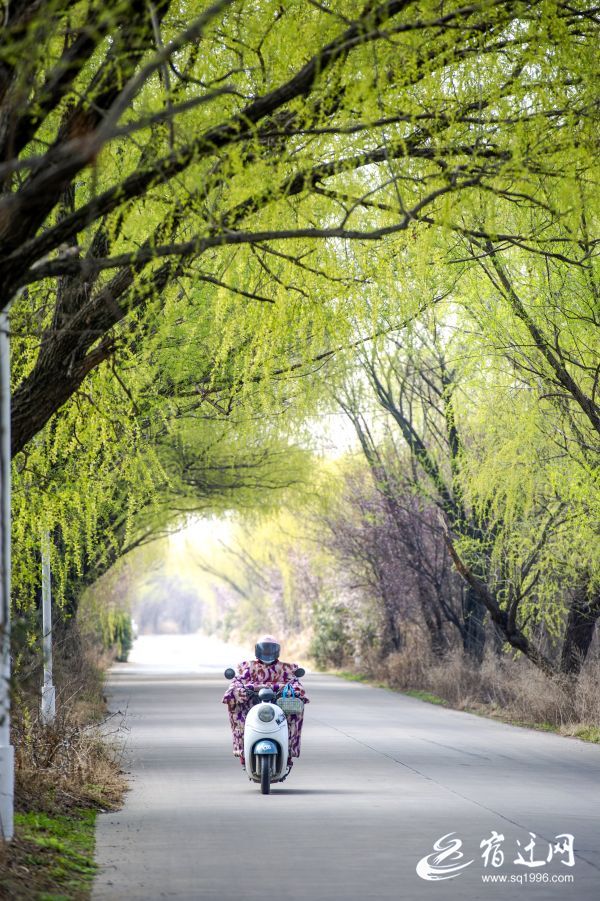 3月10日,在宿迁市京杭大运河与六塘河之间的杨柳路,道路两旁的杨柳泛青吐绿,形成一条天然的绿色隧道,令人陶醉其中。