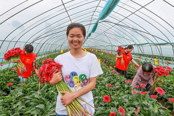 如今夫妻俩的花卉基地已拥有4万平方米的高标准连栋温室,非洲菊、百合、洋桔梗、向日葵、玫瑰等鲜花争相开放,美不胜收。同时,公司采取“支部+合作社+示范户”模式,鼓励当地农户参与花卉种植,公司再进行保底价收购,引领了当地鲜切花产业的快速发展,形成培育一个、影响一片、带动一方的示范效应,使原本较贫困的村走上了富裕道路。