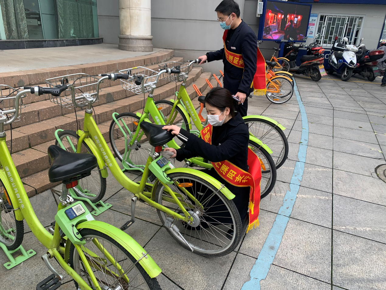 溧阳支行关爱社区老人,清洁共享单车