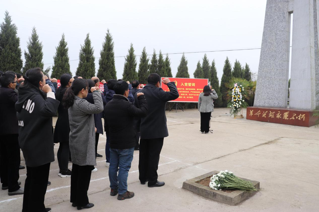 在革命烈士纪念碑前,全体人员齐声高唱《中华人民共和国国歌》,歌声激昂,响彻天宇,随后,全场静默肃立,大家怀着对革命先烈无比崇敬的心情,向烈士默哀。默哀结束,伴随着《献花曲》缓缓奏响,4名礼兵托起敬献的花篮,正步缓缓走向墓碑,将花篮摆放到烈士纪念碑前。然后,全体党员重温入党誓词,再一次接受党性洗礼。活动最后,班子领导同党员代表一起缓步绕行瞻仰并向烈士纪念碑献花,追思英烈的丰功伟绩,表达对烈士的无限敬仰和缅怀。