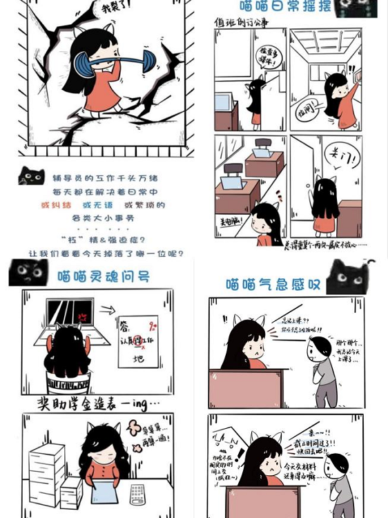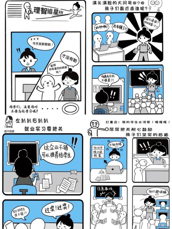 绘心原创漫画设计团队在专业教师的指导下,用俏皮可爱的卡通形象,轻松简洁的语言,展示了辅导员们一心为学生办实事的工作场景:“严慈相济”常老师,耐心地关切着学生们的学习与生活;“不善言辞”张老师,默默地保障着各项学生事务的顺利进行;“杠精”属性颜老师,公正地为同学争取着权益与福利;“知心姐姐”王老师,细致地为学生们的未来层层把关。“绘心”团队发挥专业所长,通过一幅幅时尚诙谐的画面生动展现了辅导员们与学生们坚定站在一起的决心,真诚为学生们服务的初心,让同学们更加明白传艺学院永远是自己坚实的后盾。